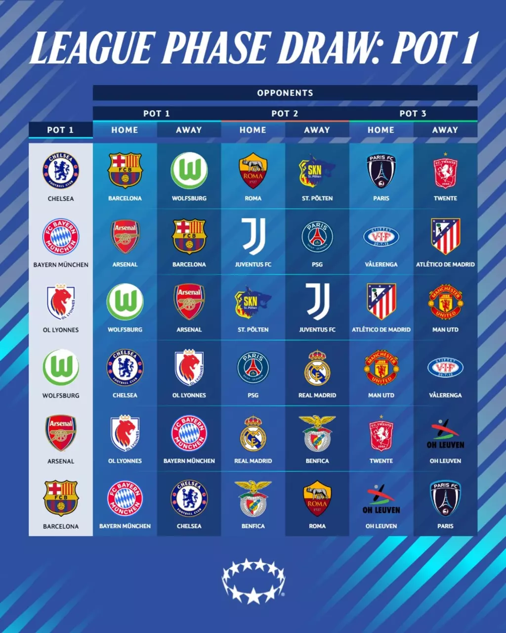 Каталонская «Барселона», считающаяся одним из главных фаворитов турнира, отправится в гости к «Челси» и примет на своем поле «Баварию». Это станет важным шансом для чемпионок Англии, которые в прошлом сезоне уступили «Барселоне» в полуфинале со счетом 8:2 по сумме двух матчей. «Манчестер Юнайтед», прошедший четыре квалификационных раунда для попадания в третью корзину, проведет домашние матчи против двух французских команд: «ОЛ Лиона» и «Пари Сен-Жермен».